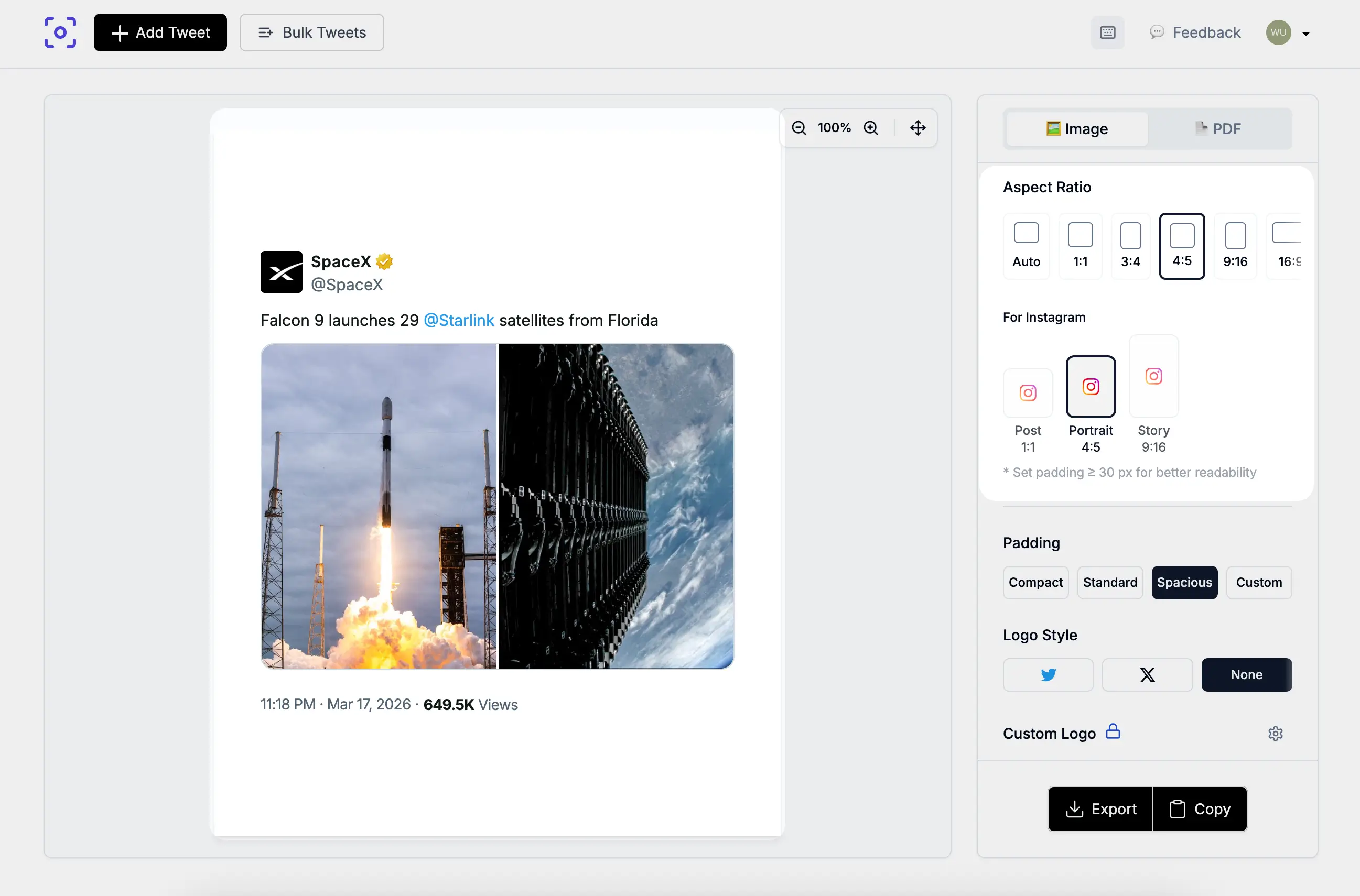 Choose Auto, 1:1, 3:4, 4:5, 9:16, or 16:9 so one tweet fits Instagram posts, Stories, Reels, or widescreen slides without manual cropping.