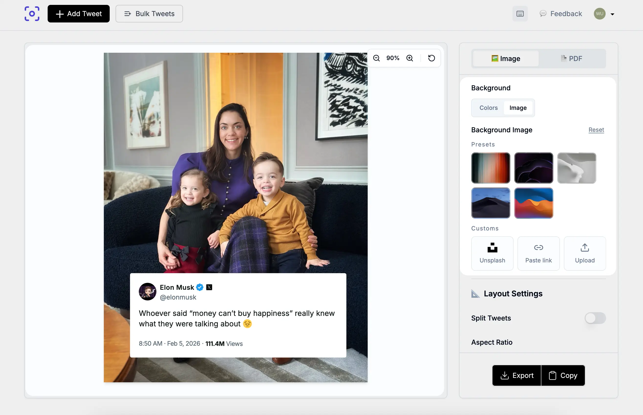 Adjust padding and zoom or drag tweet position so the content card stays readable on photos.